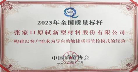 2023-12-072023年12月,張家口原軾新型材料股份有限公司憑借 “構建以客戶需求為導向的敏捷質量管控模式的經驗”,榮獲2023年全國質量標桿企業(yè)。